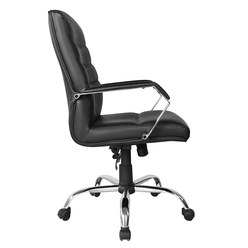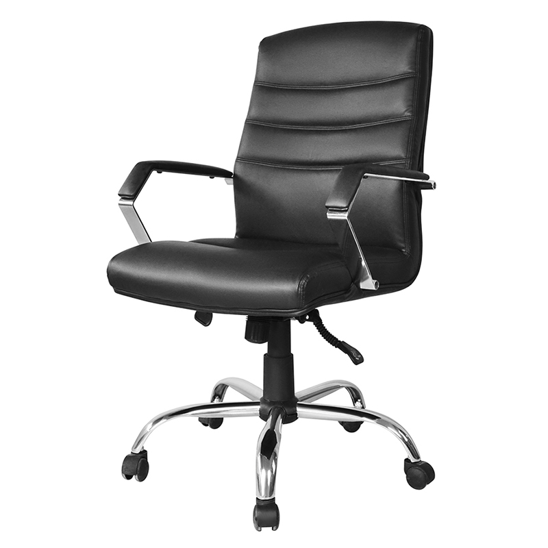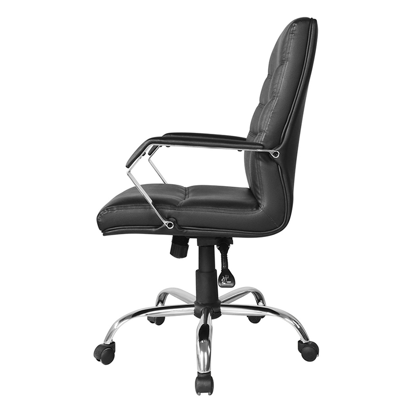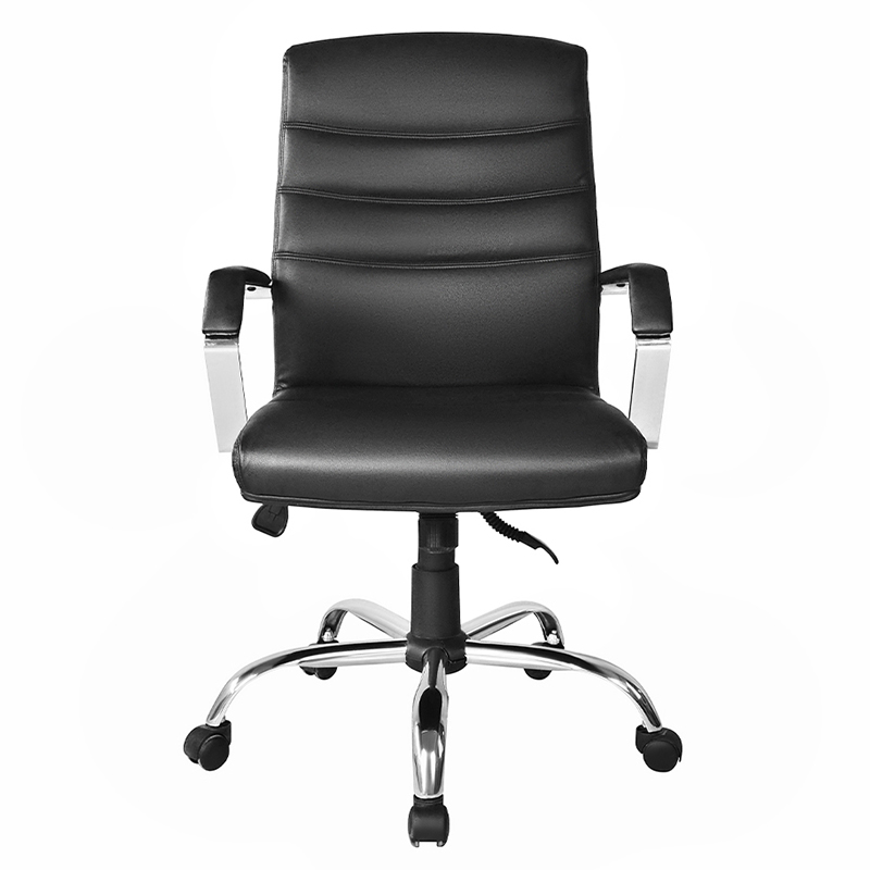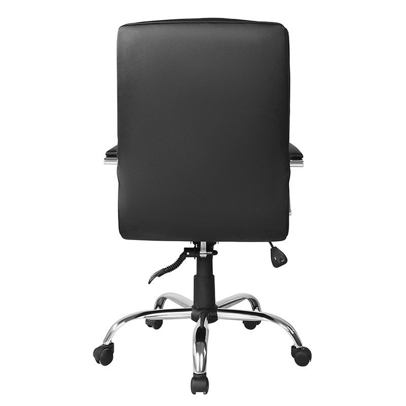 Tuoli on verhoiltu korkealaatuisella mustalla nahalla, mikä antaa sille tyylikkään ja ammattimaisen ulkonäön. Pehmustettu istuin ja selkänoja lisäävät mukavuutta, mikä tekee ihmisten pitkistä istunnoista mukavia. Korkean selkänojan ansiosta tuoli tukee ristiselkää ja vähentää selkäkipujen ja epämukavuuden riskiä.